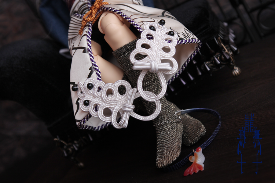 ドルパ35での販売物その1です。 幼SDサイズのセット服をお作りしました。 全部で2色*計5セットです。 セット内容 1:上着物 2:首紐飾り 3:腰紐(帯) 4:スカート1 5:スカート2 6:脚飾り 以上6点です。 モデルは幼SDリンです。 上着物 上記のとおり、二色作りました。 赤が3点、青が2点の計5点です。 フロントスナップ留めです。 袖は折りを入れる事とビーズを縫いつけた事で変形となっています。 裏地は赤生地と黒ベースの模様生地を使用しました。 首紐飾り 首に数回巻き付ける事で着用してください。 花の大きさは大きいものと小さいもの、 また、紐も赤と藍のそれぞれ二種類ありますが、ランダムでお入れしています。 スカート1、スカート2 スカート1 鱗柄の生地を使用しました。 画像のとおり、赤と青の二色ありますが、 青色の上着物には赤を、赤色の上気のもには赤をそれぞれお入れしています。 フロントにお付けした金鈴にて脱着可能です。 スカート2 画像のとおり、3種類のチュールレースを使用しましたが、それぞれデザインが少しずつ異なります。 また、それぞれのチュールレースの端にビーズ等で飾りをつけています。 ランダムにお入れしましたので、当日お選びください。 フロントスナップ留めです。 スカート1、2について 画像のとおり、中央部分についている留め具を留める事で、 スカートの裾を絞る事が可能です。 このように、チュールレースをこぼす事で魚の尾ひれをイメージしました。 また、逆に留め具を外すことで上記画像のように広げる事も可能です。 それぞれ印象がことなりますので、色々とアレンジして頂けると思います。 脚飾り 見えにくですが、画像のとおり脚にニットレースにて飾りを作りました。 靴下と同じ要領ではかせて下さい。 説明にありますとおり、全てのセット若干ずつデザインが異なります。 同じ組み合わせはございません。 すでにこちらでランダムにお選びし、ラッピングしておりますので、 当日は実際見てお好きなセットをお選びください。 |
