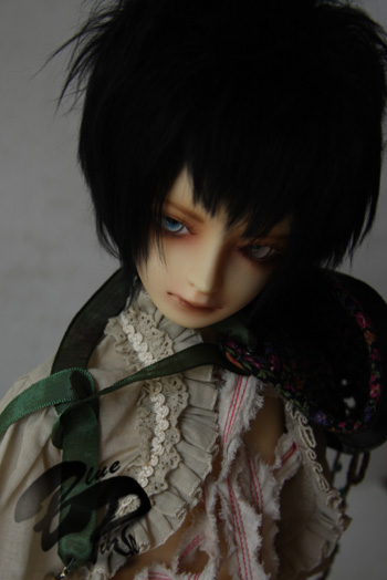 モデル(グリーンバージョンの教室Cヘッド)着用の黒ボアウィッグです。