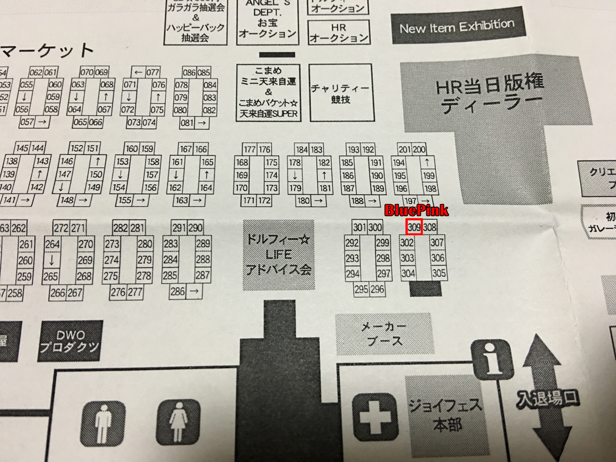 ドルパ35での販売方法 【ドールズパーティー35】 公式ページ http://www.volks.co.jp/dolpa35/ 開催日時:2016年5月5日(祝) 11時~17時【ガイドブック特典 先行入場10:00~】 会場:東京ビッグサイト 東2・3ホール +++ BluePink(ブルーピンク) スペース№309-SD 配置はこちらになります。 +++ 【販売物一覧】 ・SDGrサイズセット 1種・3セット +++ 13,000円 ・SDMidiサイズセット 1種・3セット +++ 14,000円 ・幼SDサイズセット 1種・5セット +++ 10,000円 ・羽ウィッグ +++ 4,000円~(少数ですが在庫を持って行きます) ※詳細はブログの各項目をご覧ください。 ※スペース内のドールが着用している衣装につきましては、 試作品のため販売は行っておりません。 +++ 【販売方法】 10時の会場と同時に先着順にて販売致します。 購入数につきましては、今回は特に限定いたしません。 おいくつご購入頂いても構いません。 また、今回は、ハニカムさんのレジンアイを数点委託販売させて頂くことになりました。 販売開始は、準備が出来次第ツイッターにてお知らせしますが、 目安として開場後30分~1時間後となります。 販売物の詳細は、ハニカムさんのブログやツイッター等をご参照ください。 当日は2名で参加致しますが、 1名はサポートに徹し、対応は全て私一人で行います。 不慣れな点も多く、対応が遅くなる場合があると思います。 ご迷惑お掛け致しますが、どうか広い心でお待ち頂けますと幸いです。 それでは、会場にてお待ちしております。 宜しくお願い致します。 |