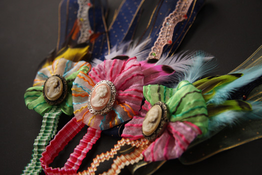 カメオ、レース、ビーズ、リボン、羽等カラフルな色合いを揃えてみました。